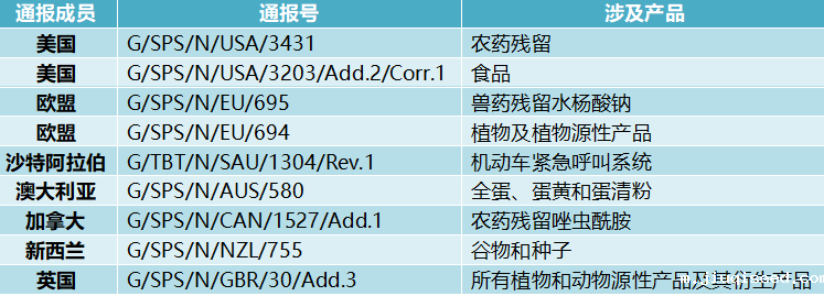 2023年11月16日,共有7个WTO成员通报9项技术性贸易措施,其中1项为TBT措施,8项为SPS措施。通报情况为:美国2项、欧盟2项、沙特阿拉伯1项、澳大利亚1项、加拿大1项、新西兰1项、英国1项。这些措施涉及农药残留,食品,植物及植物源性产品,机动车紧急呼叫系统,全蛋、蛋黄和蛋清粉,谷物和种子等。通报详情如表所示。