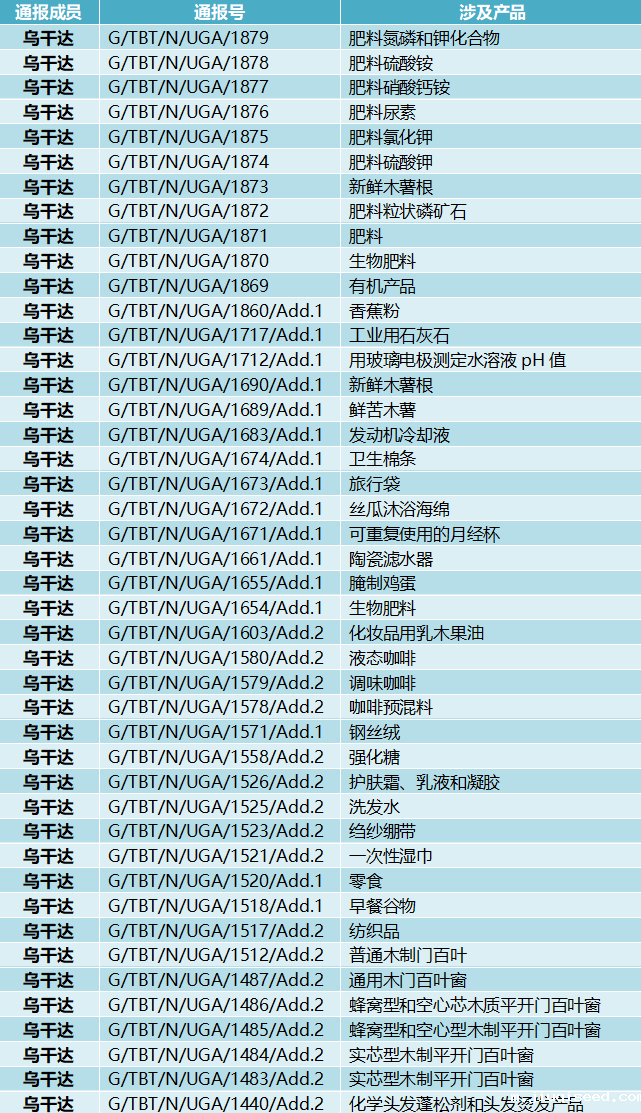2023年12月11日,共有13个WTO成员通报222项技术性贸易措施,其中215项为TBT措施,7项为SPS措施。通报情况为:乌干达65项、布隆迪37项、卢旺达37项、坦桑尼亚37项、肯尼亚25项、斯威士兰11项、美国4项、日本1项、乌克兰1项、印度1项、澳大利亚1项、沙特阿拉伯1项、中国台湾1项。这些措施涉及肥料,有机产品,工业用石灰石,发动机冷却液,旅行袋,调味咖啡,洗发水,一次性湿巾,零食,通用木门百叶窗,发油和固体光亮剂,化妆品,道路限速器,使用液化石油气的设备,固体废物,生牛奶,货车,重型发动机和车辆,无线电设备,制冷设备等。通报详情如表所示。