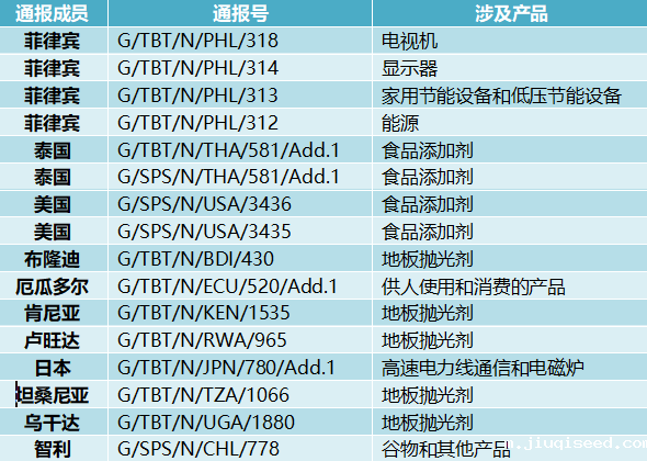 2023年12月13日,共有11个WTO成员通报16项技术性贸易措施,其中12项为TBT措施,4项为SPS措施。通报情况为:菲律宾4项、泰国2项、美国2项、布隆迪1项、厄瓜多尔1项、肯尼亚1项、卢旺达1项、日本1项、坦桑尼亚1项、乌干达1项、智利1项。这些措施涉及电视机,家用节能设备和低压节能设备,能源,食品添加剂,地板抛光剂,供人使用和消费的产品,高速电力线通信和电磁炉等。通报详情如图表所示。