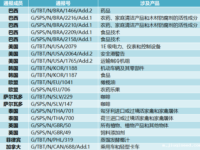 2023年12月21日,共有9个WTO成员通报20项技术性贸易措施,其中10项为TBT措施,10项为SPS措施。通报情况为:巴西5项、美国3项、韩国2项、欧盟2项、萨尔瓦多2项、泰国2项、英国2项、菲律宾1项、加拿大1项。这些措施涉及药品,食品技术,安全港警告,运输制冷机组,机动车辆及其零部件,橄榄油,咖啡,饲料添加剂,乘用车和轻型卡车等。通报详情如图表所示。
