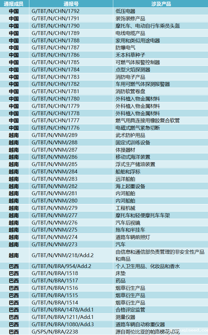 2024年1月5日,共有21个WTO成员通报120项技术性贸易措施,其中104项为TBT措施,16项为SPS措施。通报情况为:中国17项、越南17项、巴西12项、美国8项、韩国7项、肯尼亚6项、卢旺达6项、布隆迪6项、坦桑尼亚6项、乌干达6项、乌克兰5项、哈萨克斯坦5项、科威特4项、日本4项、以色列3项、菲律宾2项、加拿大2项、哥伦比亚1项、玻利维亚1项、斯洛文尼亚1项、智利1项。这些措施涉及低压电器,燃气用具连接用橡胶复合软管,工程机械,汽车后视镜,药品,烟草衍生产品,测量仪器,家用热水器,数字低功率电视和电视转播台,液体化学品,有机畜禽,电器,光源,洗涤剂,插头和插座等。通报详情如图表所示。