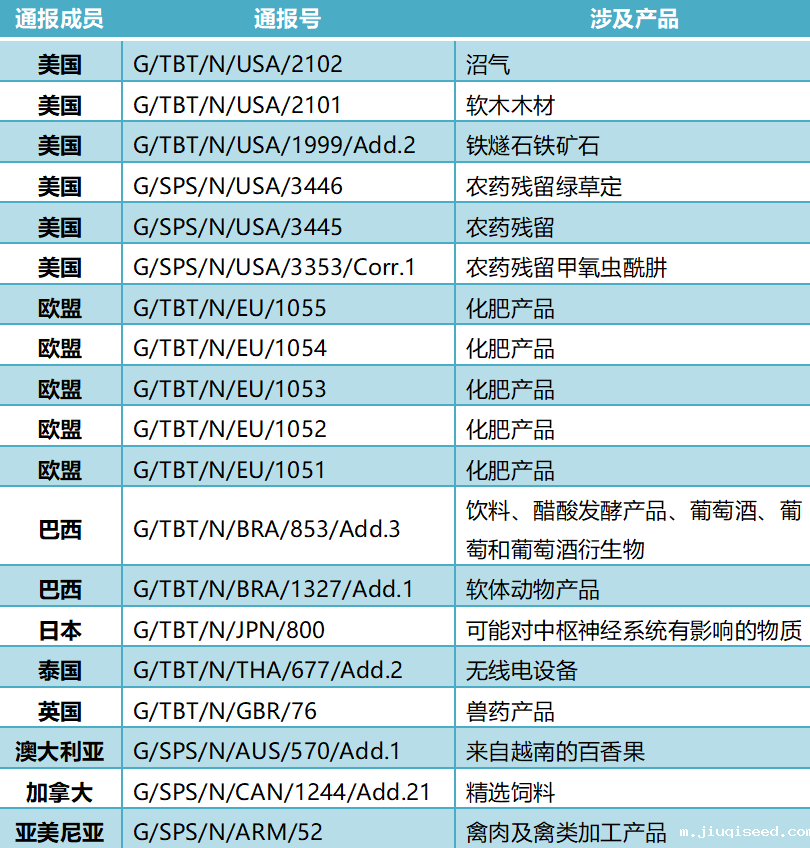2024年3月7日,共有9个WTO成员通报了19项技术性贸易措施,其中13项为TBT措施,6项为SPS措施。通报情况为:美国6项、欧盟5项、巴西2项、日本1项、泰国1项、英国1项、澳大利亚1项、加拿大1项、亚美尼亚1项。这些措施涉及沼气,软木木材,铁燧石铁矿石,化肥产品,可能对中枢神经系统有影响的物质,无线电设备等。通报详情如图表所示。