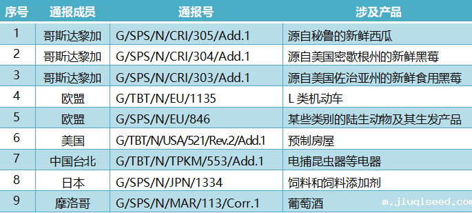2025年4月25日,共有6个WTO成员通报了9项技术性贸易措施,其中3项为TBT措施,6项为SPS措施。通报情况为:哥斯达黎加3项、欧盟2项、美国1项、中国台北1项、日本1项、摩洛哥1项。这些措施涉及源自秘鲁的新鲜西瓜,L类机动车,某些类别的陆生动物及其生发产品,预制房屋,电捕昆虫器等电器,饲料和饲料添加剂,葡萄酒等。通报详情如表所示。