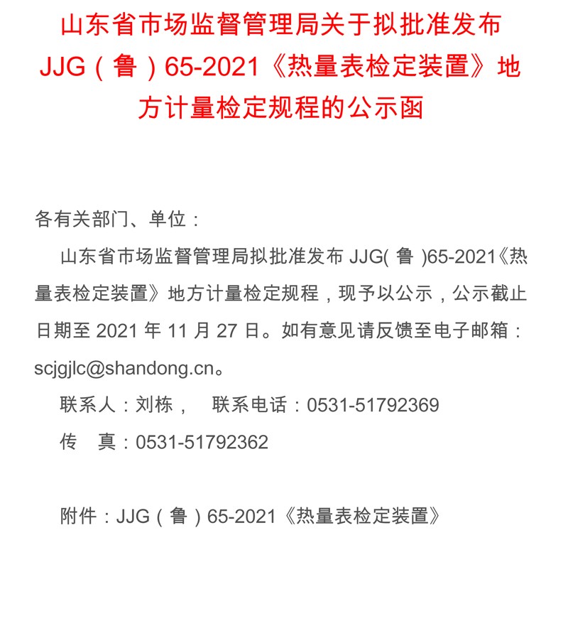 山东省市场监督管理局拟批准发布JJG(鲁)65-2021《热量表检定装置》地方计量检定规程,现予以公示,公示截止日期至2021年11月27日。如有意见请反馈至电子邮箱:scjgjlc@shandong.cn。