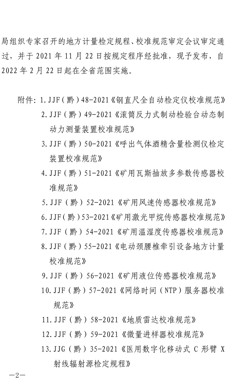 按照《贵州省地方计量检定规程校准规范制修订工作程序》规定,我省制修订的JJF(黔)48-2021《钢直尺全自动检定仪校准规范》、JJF(黔)49-2021《滚筒反力式制动检验台动态制动力测量装置校准规范》、JJF(黔)50-2021《呼出气体酒精含量检测仪检定装置校准规范》、JJF(黔)51-2021《矿用瓦斯抽放多参数传感器校准规范》、JJF(黔)52-2021《矿用风速传感器校准规范》、JJF(黔)53-2021《矿用激光甲烷传感器校准规范》、JJF(黔)54-2021《矿用温湿度传感器校准规范》、JJF(黔)55-2021《电动颈腰椎牵引设备地方计量校准规范》、JJF(黔)56-2021《矿用液位传感器校准规范》、JJF(黔)57-2021《网络时间(NTP)服务器校准规范》、JJF(黔)58-2021《地质雷达校准规范》、JJF(黔)59-2021《微量进样器校准规范》、JJG(黔)35-2021《医用数字化移动式C形臂X射线辐射源检定规程》、JJF(黔)60-2021《荧光定量聚合酶联反应分析仪校准规范》等14个地方计量技术规范,已经2021年9月1日至2日省市场监管局组织专家召开的地方计量检定规程、校准规范审定会议审定通过,并于2021年11月22日按规定程序经批准,现予发布,自2022年2月22日起在全省范围实施。 附件: |