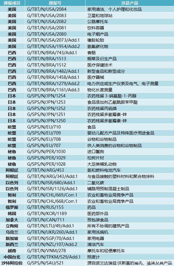2024年1月4日,共有18个WTO成员通报42项技术性贸易措施,其中29项为TBT措施,13项为SPS措施。通报情况为:美国7项、巴西7项、日本5项、欧盟4项、秘鲁3项、阿根廷2项、以色列2项、智利2项、俄罗斯1项、韩国1项、加拿大1项、立陶宛1项、乌克兰1项、新加坡1项、新西兰1项、越南1项、中国台北1项、沙特阿拉伯1项。这些措施涉及卫星和地球站,公路摩托车,饮料容器,电子烟产品,橡胶轮胎,烟草及衍生产品,医疗器械,氢和燃料电池汽车,二氧化碳,药品,预包装食品,家用洗碗机,清洁汽车等。通报详情如图表所示。